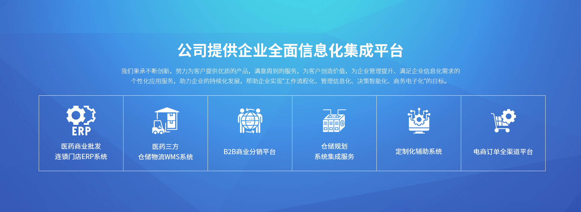 公司提供企業全面信息化集成平臺,產品包括:ERP供應鏈管理系統、WMS倉儲管理系統、電子首營及藥檢單平臺、比價標價系統、小程序商城及開發定制、訂單中臺系統、B2B電商平臺、移動支付等產品,我們秉承不斷創新,努力為客戶提供優質的產品,滿意周到的服務,為客戶創造價值,為企業管理提升、滿足企業信息化需求的個性化應用服務,助力企業的持續化發展,幫助企業實現"工作流程化、管理信息化、決策智能化、商務電子化"的目標。